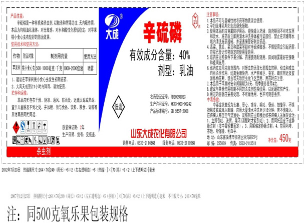 辛硫磷是一种有机磷杀虫剂,以触杀和胃毒为主,无内吸作用。本品为均相油状液体,对光敏感,对水和酸性介质较稳定,对苹果桃小食心虫有较好的防治效果。